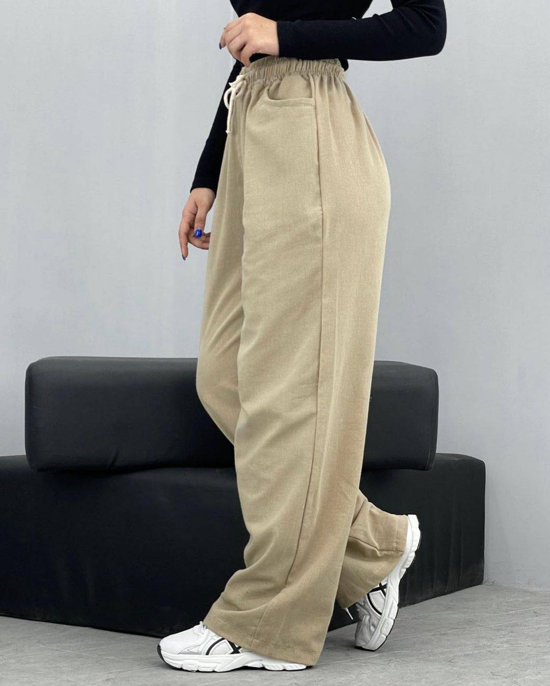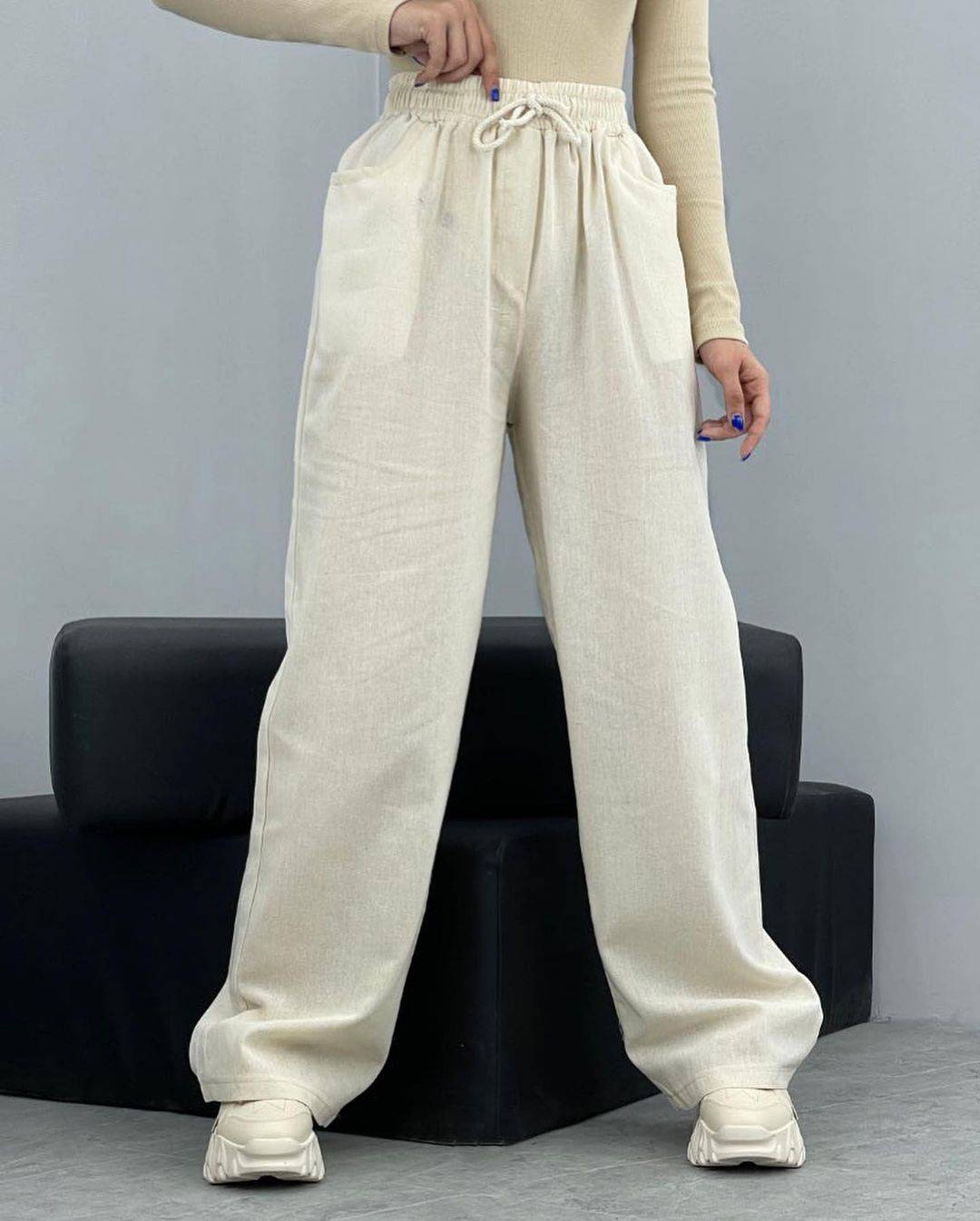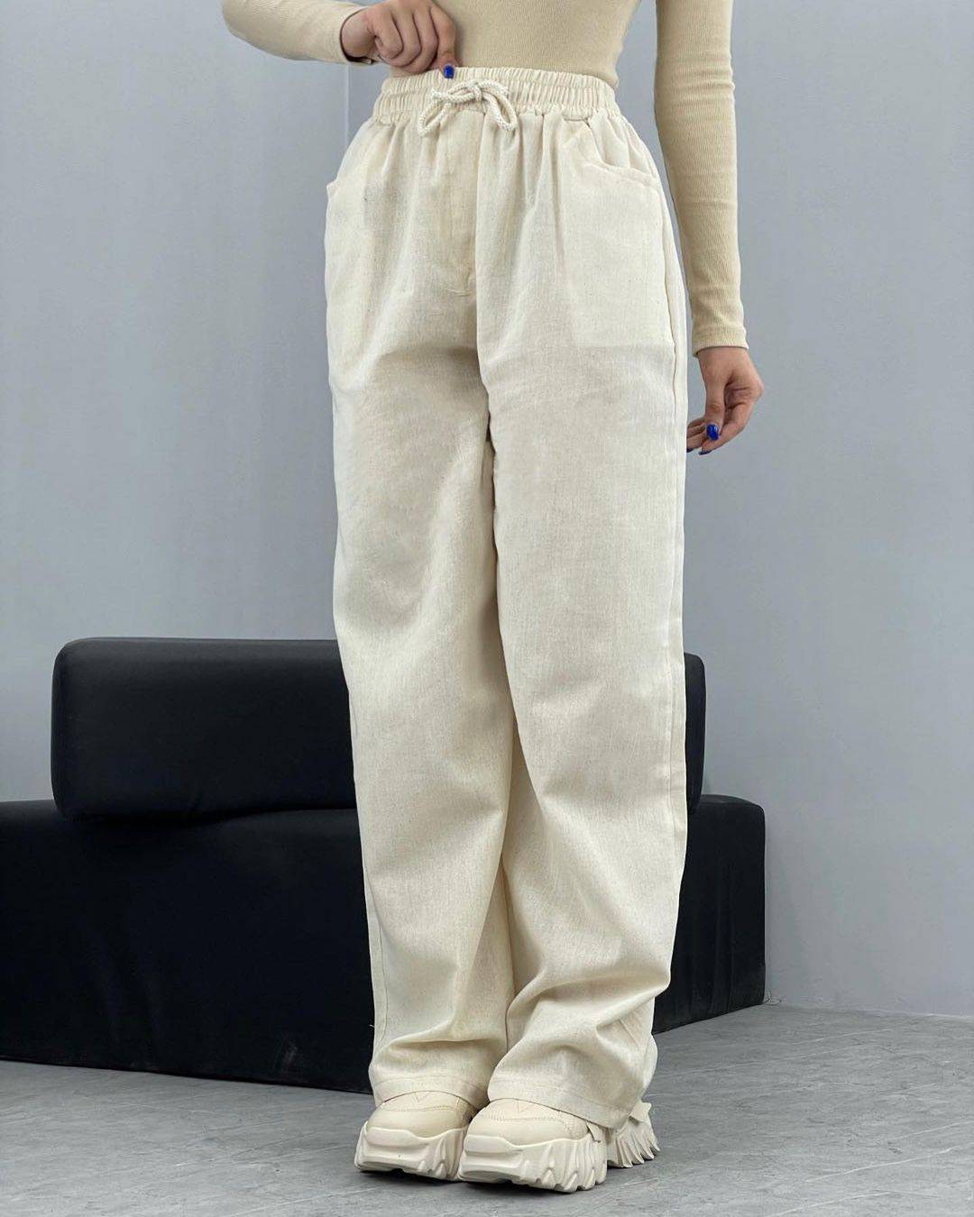 خرید شلوار بگ زنانه لینن خارجی کمرکش با قد 100 و 105 و رنگبندی متنوع. خنک و مناسب استفاده روزمره.