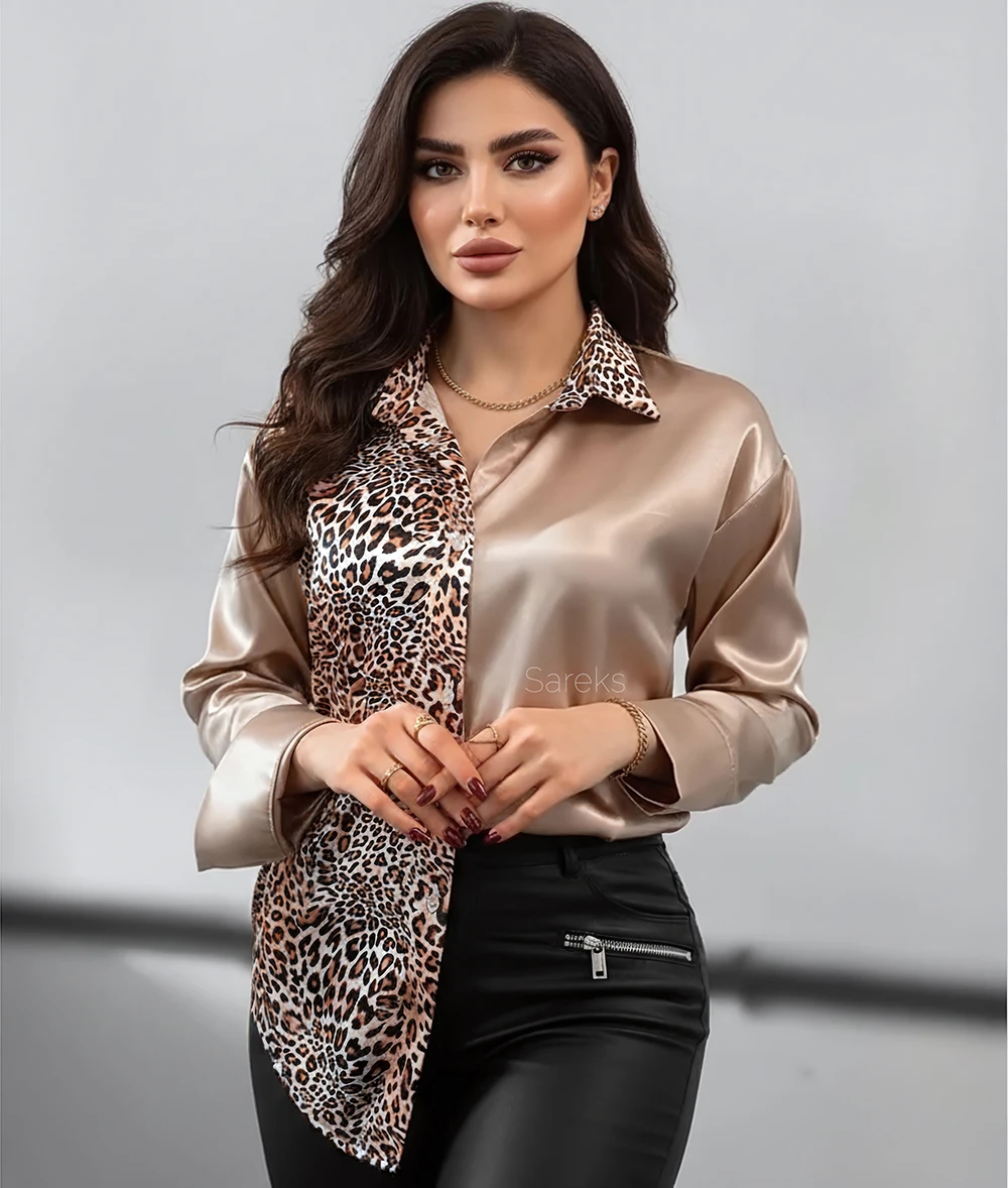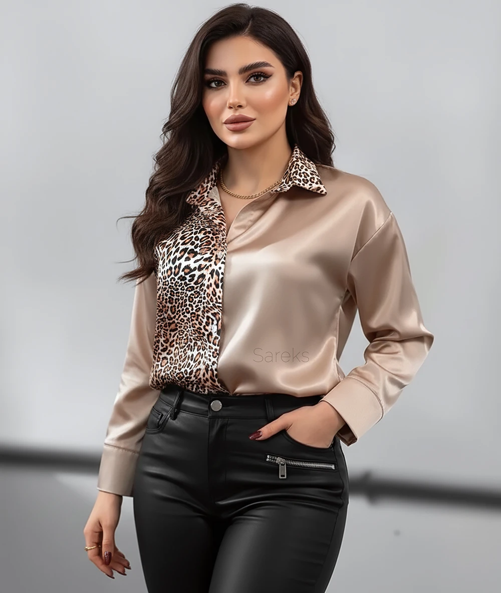 شومیز ساتن ابریشم طرح پلنگی نسکافه‌ای